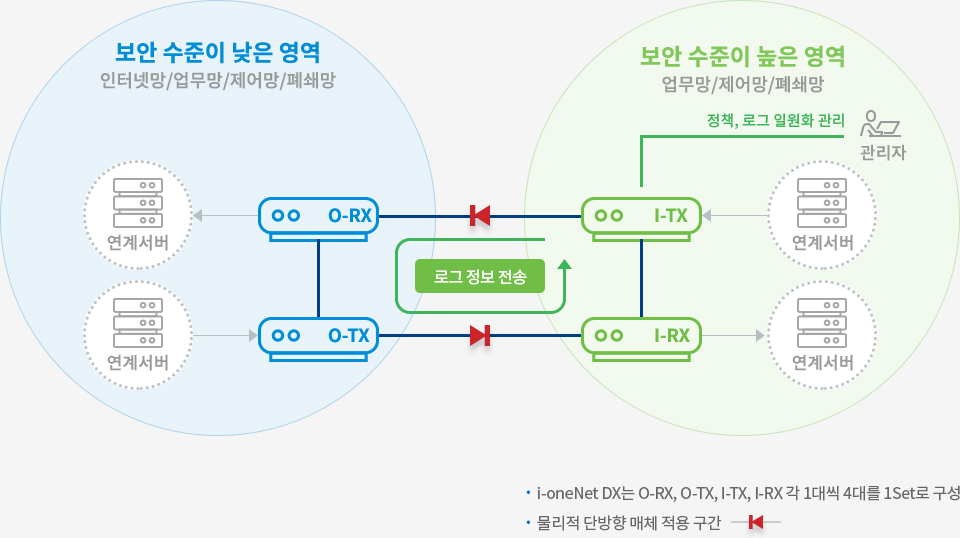 보안수준이 높은 영역으로의 외부접근을 원천적으로 차단하고, 보안수준이 낮은 영역으로만 데이터를 전송하는 일방향 망연계 솔루션